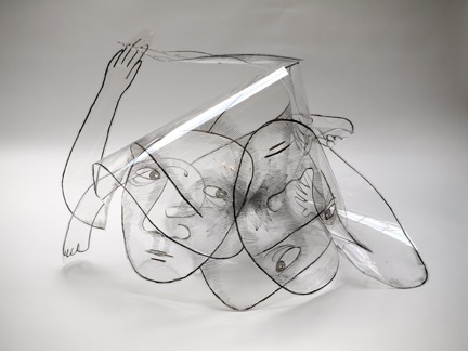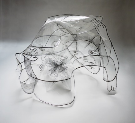 I am an artist working mainly with clear materials, so clear plastic became a natural selection for reasons of economy and its relative ubiquity. The other reasons why I chose to work with plastic instead of glass, resin or other clear material, is because I wanted to screenprint onto the material and then be able to shape the resulting print into a three-dimensional object almost immediately and without machinery. Plastic allowed me to put my ideas down onto a tangible material quickly and cheaply.