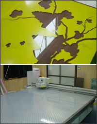 本来、パッケージ業界・段ボール業界などで盛んに導入されている Kongsberg (コングスバーグ)ですが、かなり毛色の違うガラス加工という業界に導入した経緯として、 もともと社長様が、作業時間の短縮を目的として、加工用のガラスに貼られたカッティングシートを模様カットできる機械を探しており、 弊社の Kongsberg も各社から出ている競合製品の中からの導入候補の1つであったとのことです。