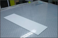 そこで、通常ならばカット資材固定用に使用する吸引用バキュームを逆の発想で逆噴射させています。逆噴射させることにより、200Kgを超えるガラスであっても、まるでゲームセンターにあるエアホッケーのパックのようにいとも簡単に盤面上で移動させることが出来るようになり、女性でも簡単に作業が行なえるようになっていました。