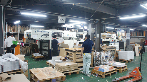 工場内では断裁機、トムソン機が並んでいる