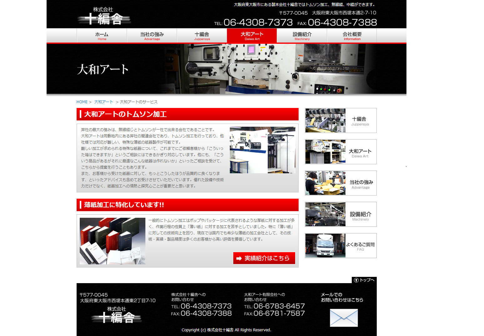 大阪府東大阪市内で1984年の創業以来、トムソン加工を専門業務としている。 また同敷地内にある関連会社である「株式会社十編舎」は、断裁・折り加工・綴じ加工・仕上げ加工など、 製本全般をサービスとして提供。トムソン・製本業務を1社で対応できる会社である。