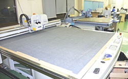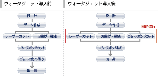 ウォーター ジェット導入後は、デジタルデータからのカッティングが可能となり、データが出来上がった瞬間にゴム・スポンジ加工の工程へと進むことができる。カット、刃曲げ、スポンジの工程が同時進行できることで大幅な作業時間の短縮に成功した。