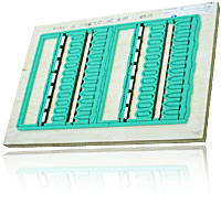 作図されたCADデータにあわせゴム・スポンジは自動カッティングされる。図面あわせでカットされたゴム・スポンジをパズルの様に貼り付けるだけで木型が完成するのだ。