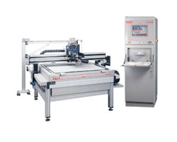 (面板加工機/サンプルカッターKongsberg(コングスバーグ) XL/Artios CAD(アルティオス キャド)/ウォータージェット)ほとんどの工程をデジタル化したF&Aでは1つのCAD図面を製作工程のスタートとし、デジタル制御ならではの短納期・高精度を可能にした。