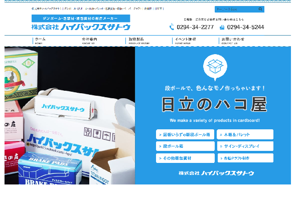 株式会社ハイパックスサトウは、茨城県日立市に位置する段ボール・包装材・梱包材をメインに取扱う昭和23年設立の老舗のボックスメーカーである。重量梱包箱を多く取り扱っていた同社だが、現在は梱包箱だけではなくディスプレイ什器、サイン、クラフト商品の取扱い、段ボールを使った舞台・イベントセット提案などその展開は多岐に渡る。