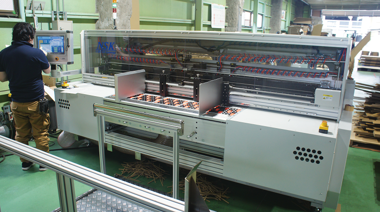 八木氏 ケース製造に関して解決すべき課題が2つありました。1つ目の課題は労力の軽減で、 弊社で手掛ける段ボールケースは大小さまざまであり特に重量包装用のケースとなるとシートサイズが大きく、 かつダブルなどの厚みのある段ボールシートを使うことが多くあるのでこのシートを取りまわす労力が非常に大きく、 労働環境的に良くない状態でした。 特に連切り断裁機を使って作ることの多いヤッコ型の場合、機械にシートを4回通す必要があります。 この1ケース作るのに4回資材を持ち上げるという重労働を軽減させることが機械導入の目的の1つです。