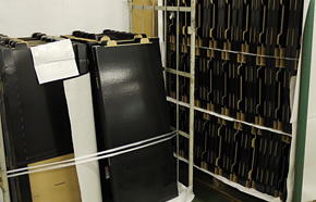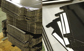 グルアー で背面スタンドまで取り付けた製品を、折り・チェックを行うコンベアに流しそのままパッキング。特にラミーナを導入してからは、等身大POPは在庫をつくらず糊貼り工程から段ボールにそのままに入り出荷されているという。過程在庫が発生するとスペースも必要だが、在庫したものをさらに別の人間が取りに行く、など時間のムダが発生する。加工の開始から輸送までを一度で終わらせるその生産力とスピードが、他社との違いを圧倒的なものにしている。