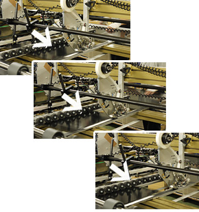 グルアー の特長として、従来の作業ラインと組立合せることのできる ”ワーキングステーション” がある。 グルアー で糊づけされた部品が ワーキングステーション に流れ、例えば人型POPならば背面スタンドの取り付けを行う。ワーキングステーションは、位置合わせ用の”アテ”が加工スピードに合わせ飛び出す仕組みとなっており、細かに位置を合わせなくとも”アテ”を目安に流れてくる製品にスタンドをポンポンと置いていけばよい。生産効率が一定である機械に合わせ加工を行うことで、作業の先が読めるのも利点の1つだ。