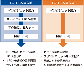 FOTOBAはプリントアウトされたメディアを必要なサイズに自動カットできるマシンである。インクジェットプリンタの高速化に伴って、デリバリーの高速化を実現できるようになったが、ポスターなどの小ロット印刷物については、最終仕上げのカッティング工程が手作業によるもので、梱包・出荷までのフローの中でも特に問題視されていた。