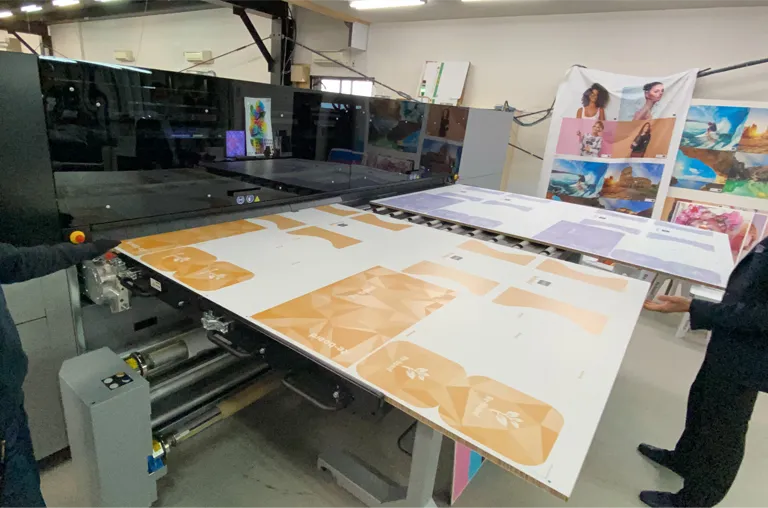 「現場での貼り工程を無くすには、ボード(板物)へのダイレクト印刷が必須であり、ボード対応機の導入を検討し始めてから、実に5、6年もの月日が流れていました。