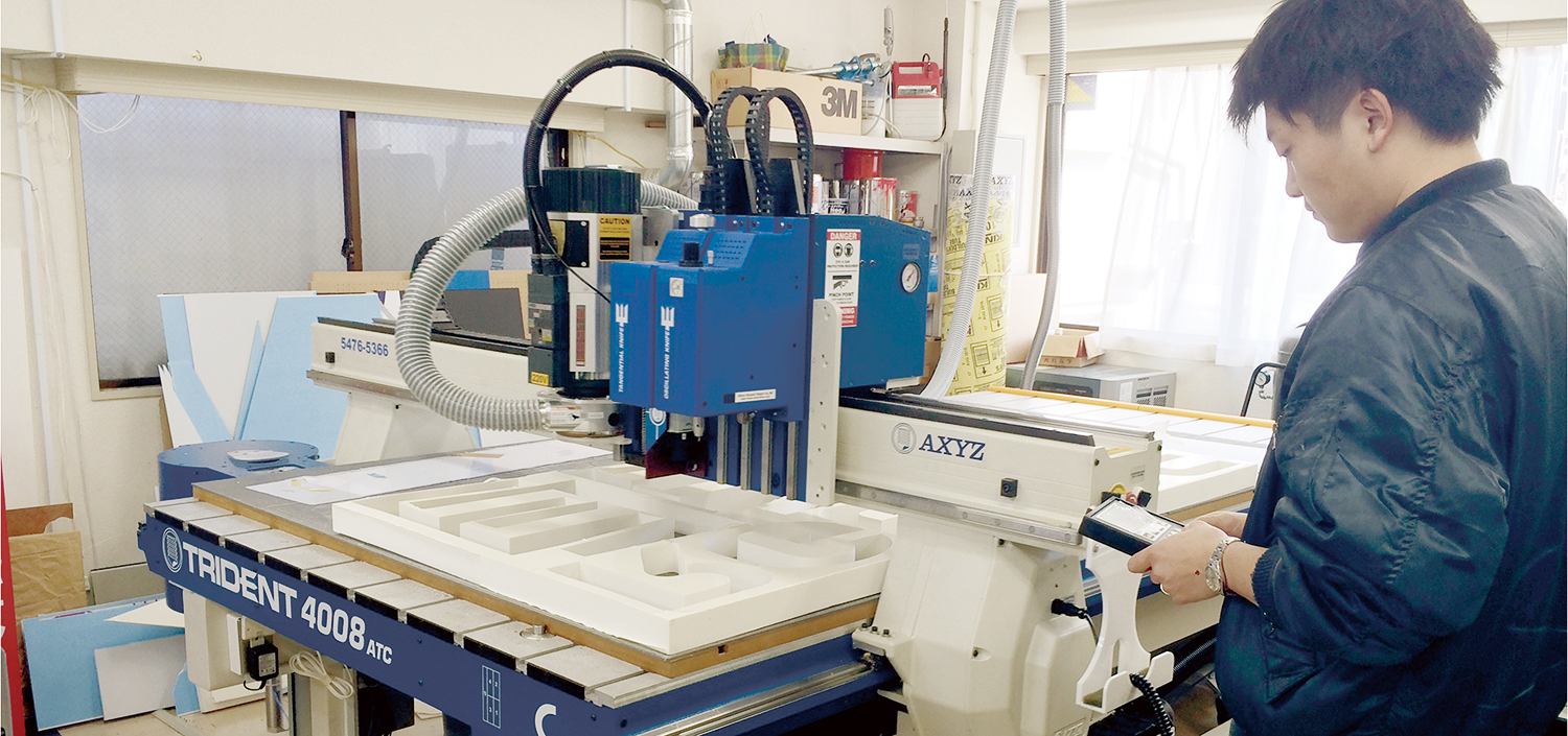 AXYZトライデントを導入したきっかけは、50mmの厚い物の手加工をデジタルに置き換えたいと考えたこと。 国内外の様々な機械を検討したが国内の機械では加工制限がありできることが少なく、逆に海外の機械はなんでもできるが機械サイズが大きいなどであったが 導入したAXYZトライデントは他と比較しコンパクトであったこと、更にヘッドが3つついており、刃物・ミーリングとセット変えなしで稼働でき、 板紙の加工からカルプの加工まで資材やサイズを選ばず加工範囲が広いこと、操作が簡易であることから導入に至った。