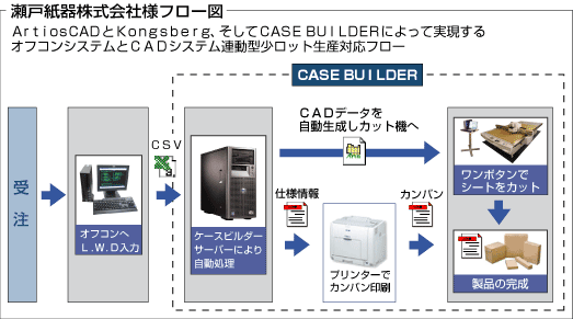 瀬戸紙器様では総合紙器設計用CADであるArtiosCAD(アルティオス キャド)、小ロット生産機であるKongsberg(コングスバーグ)、そしてオフコンシステムとCADシステムを連動させるCASE BUILDER(ケースビルダー)が導入されている。 ArtiosCAD及びKongsbergは、もともとは営業用に高品質のサンプルを作成するために 導入を決定したという。しかし、現在ではそのカット時の効率性と出来上がった製品の品質に着目し、顧客からの 小ロット注文や品質が求められる製品の生産時に運用されている。 そして、このCADとカット機の小ロット生産システムをさらに 効率化するために導入されたのがCASE BUILDERである。