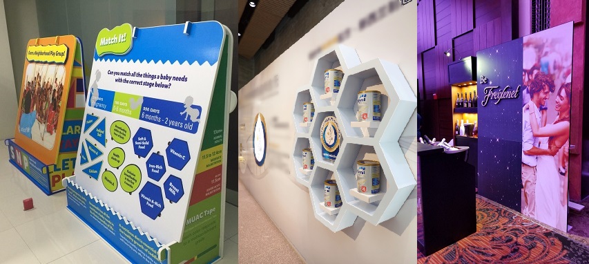 リボードのメリットを活かしたイベントブースや什器、カルプなどと組み合わせた立体的な空間演出を積極的に展開している。