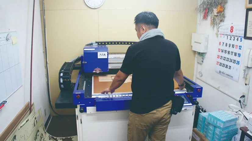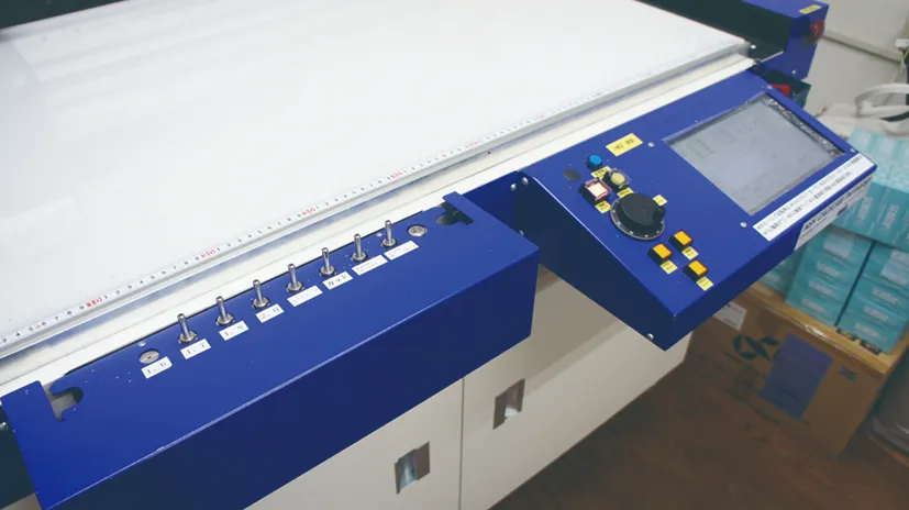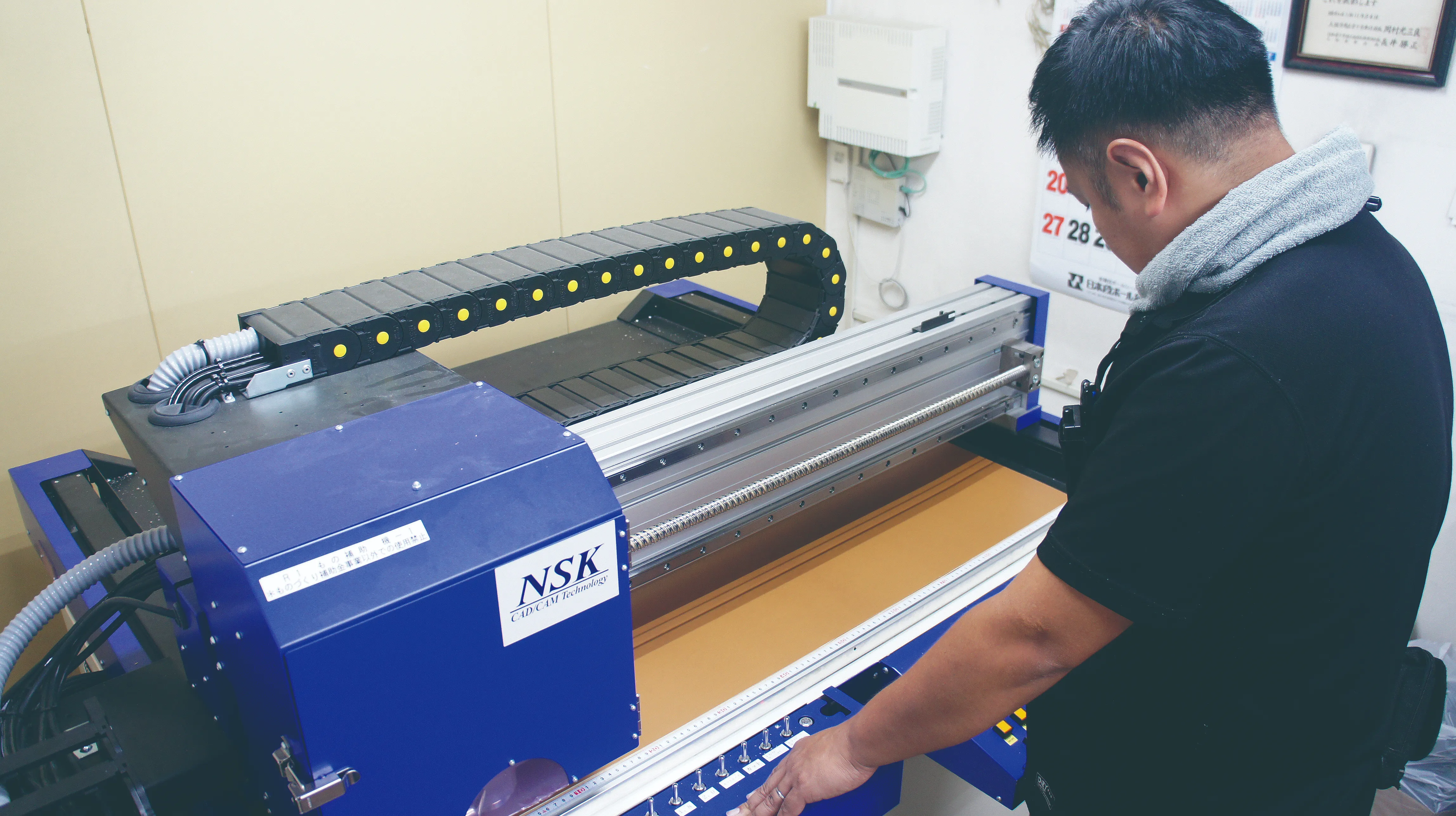 面板作成機 NS-Crease Line 8ATCの方も、加工パラメータが設定として保存でき、各ツールの高さもセンサーによる自動補正なので、 基本はデータを読み込んで出力指示を行うだけで、あとはツールチェンジも含めて全自動加工してくれます。 深さの精度も特別なメンテナンスなしにも関わらず導入から現在まで高精度を維持し続けてくれています。 最初はトムソンに面板を付ける作業で戸惑うこともありましたが、それもすぐに慣れることができました。