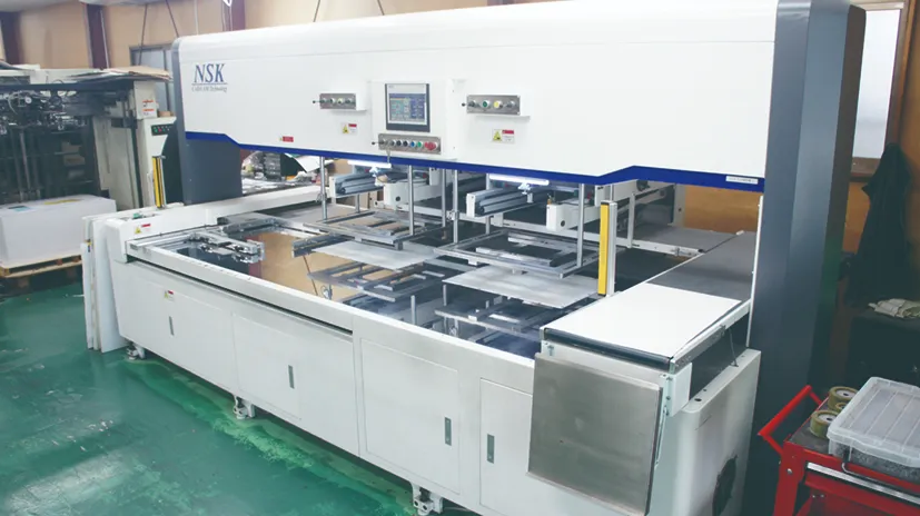 詳しくはこちら 0.01mm単位の繊細な調整が求められる面板加工に大きなアドバンテージを持つNS-Crease Line 8ATC。 オートツールチェンジャー機能を搭載した面板作成システムです。 8本のツールを搭載して、用途に合わせて自動でツールを持ち変えて面板加工を行います。ツール交換が全自動で行われるため、ツール交換の手間が全く必要なく、 作業時間・効率をアップします。