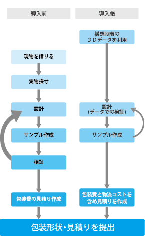 同社は ArtiosCAD と CAPE PACK を使用し、これまで実際の製品を採寸し設計していた工程を、 クライアントの設計段階(構想段階)の製品3Dデータを元にして短時間で設計する手法を確立。さらにこの段階で CAPE PACK (ケープ パック)を利用し最適な積載の算出や物流コストをシミュレート。これにより、クライアントの製品構想段階で包装設計・物流コスト削減の提案が可能となった。
