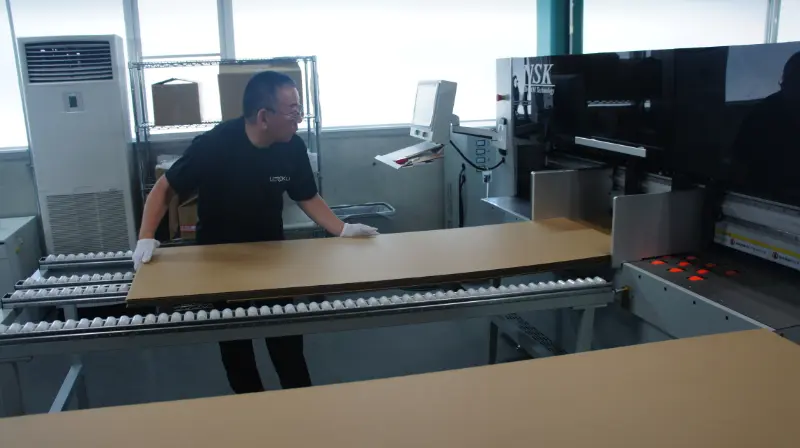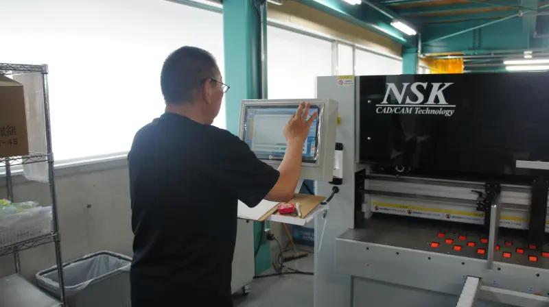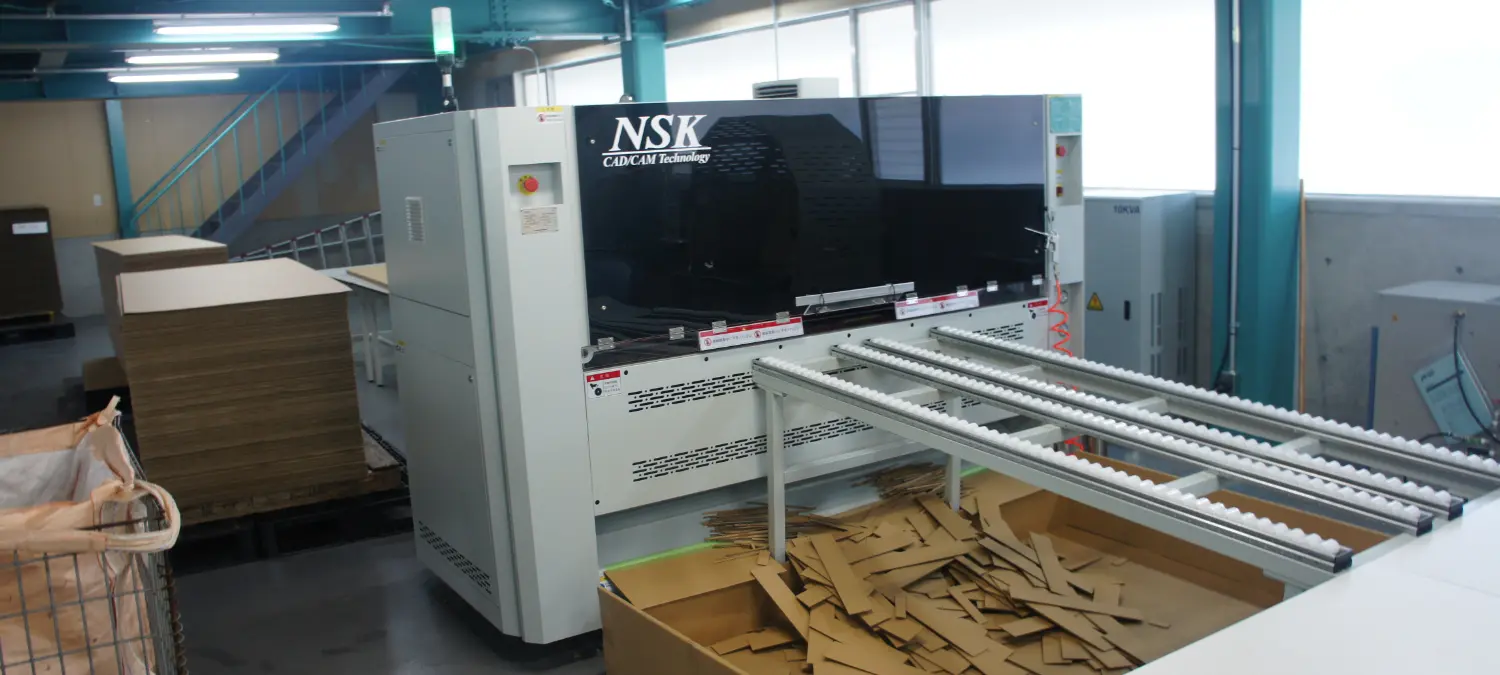 中辻氏 まず私自身がこういった加工機械を業務で使用することが初めてであり、導入前は私で扱えるのかが非常に不安でした。 しかしNSKのインストラクターによる丁寧な指導とフォローにより、3日間の初期指導で使いこなせるようになりました。 基本的な操作性については、本当に初心者でも扱えるほどの簡潔性を持っていると思います。 加工データについては形状とサイズ入力だけで段取りができ、よく使用するサイズものに関しては設定を保存しておくこともできるので、製造指示が来てから数秒後には生産を開始できます。 鋭利な刃物を搭載している機械ですが、安全性も十分考慮されているので、安心して使うことができます。 品質面においても、サイズの正確さはもちろんですが、段違い罫線機能により『逃げ』を考慮した箱ができるため、作図の知識がなくても組みやすくて美しい箱が簡単に作れます。 加工スピードも早く、1ケース6秒ほどでできるので急な生産指示にも十分対応できます。 ある程度の数を作る際も、ボトムフィーダー方式なので機械の加工中でもシートを追加供給でき、一人でも機械を止めることなく連続生産を行うことができます。