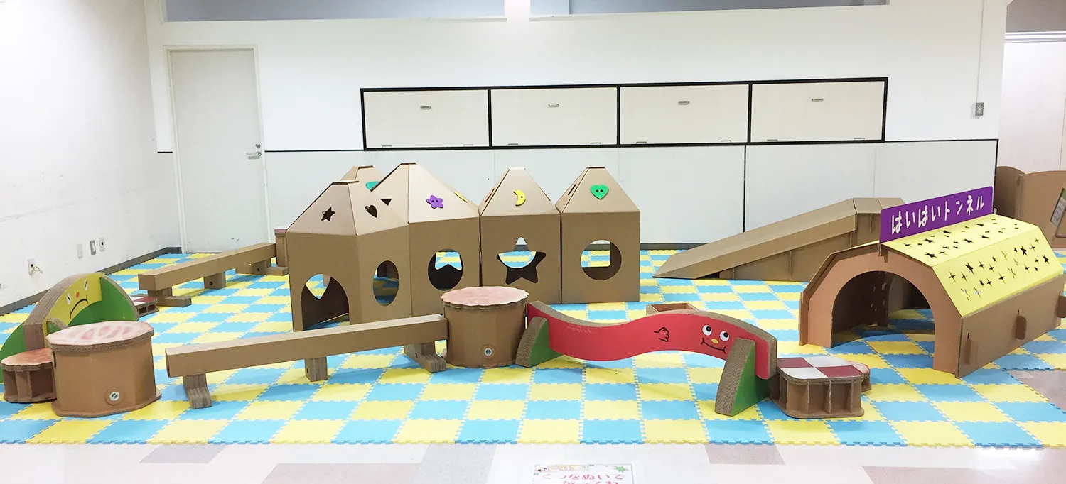 段ボールで作成したオブジェ自体は他でもありますが、触れない・見るだけといったものが多い中、弊社の段ボール遊具は子供たちに実際に使って遊んで頂くというコンセプトを元に企画されています。そのため子供が参加する体験型のイベントなどで非常に好評を頂いております。」