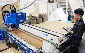 また段ボール以外の材料を加工するニーズも出てきたため、CNCルーターのAXYZ TRIDENTも最近導入しました。 これらのおかげでほぼ全ての加工が社内で行えるようになっています。NSKさんが提供してくれる機器はどれも直感的に使え、強化段ボールなども難なく加工できます。設計・製造を担当する身としては、設計作業に集中できるのが非常に助かります。」