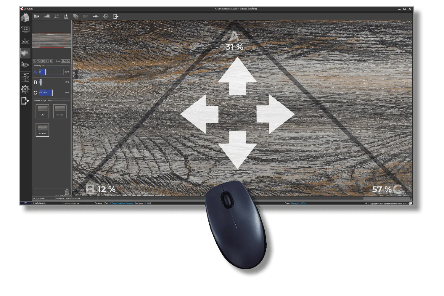 スライダーを動かすだけで複数のスキャンデータを融合させ、全く新しいライティングデータを創り出します。 また、マウスボタンを押したまま画面上をドラッグすることで読み込まれた3つの画像(A・B・C)の要素を直感的にブレンド。その結果が素早く画面に反映され、リアルタイムで確認できます。