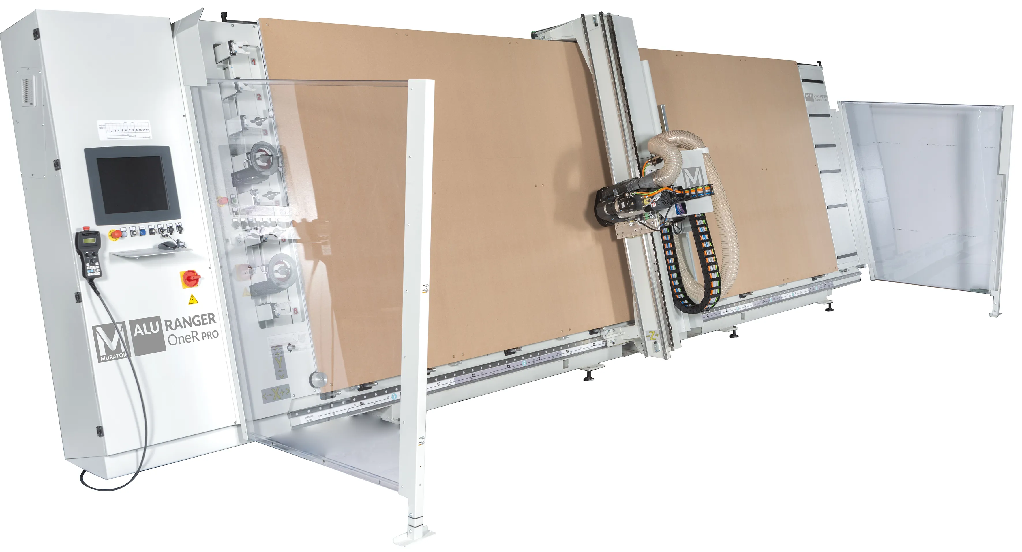 The high productivity of the Alu Ranger CNC, already guaranteed by the combination of the best tools, suitable for each different material, can be increased thanks to Alu Loader, the patented automatic panel loading and positioning system without an operator, and thanks to the possibility of also automatically controlling unloading, with Off Loader, the patented vacuum table covered by a breathable cloth. The integrated work cell-loading, processing, unloading-can be controlled and supervised by a single operator.