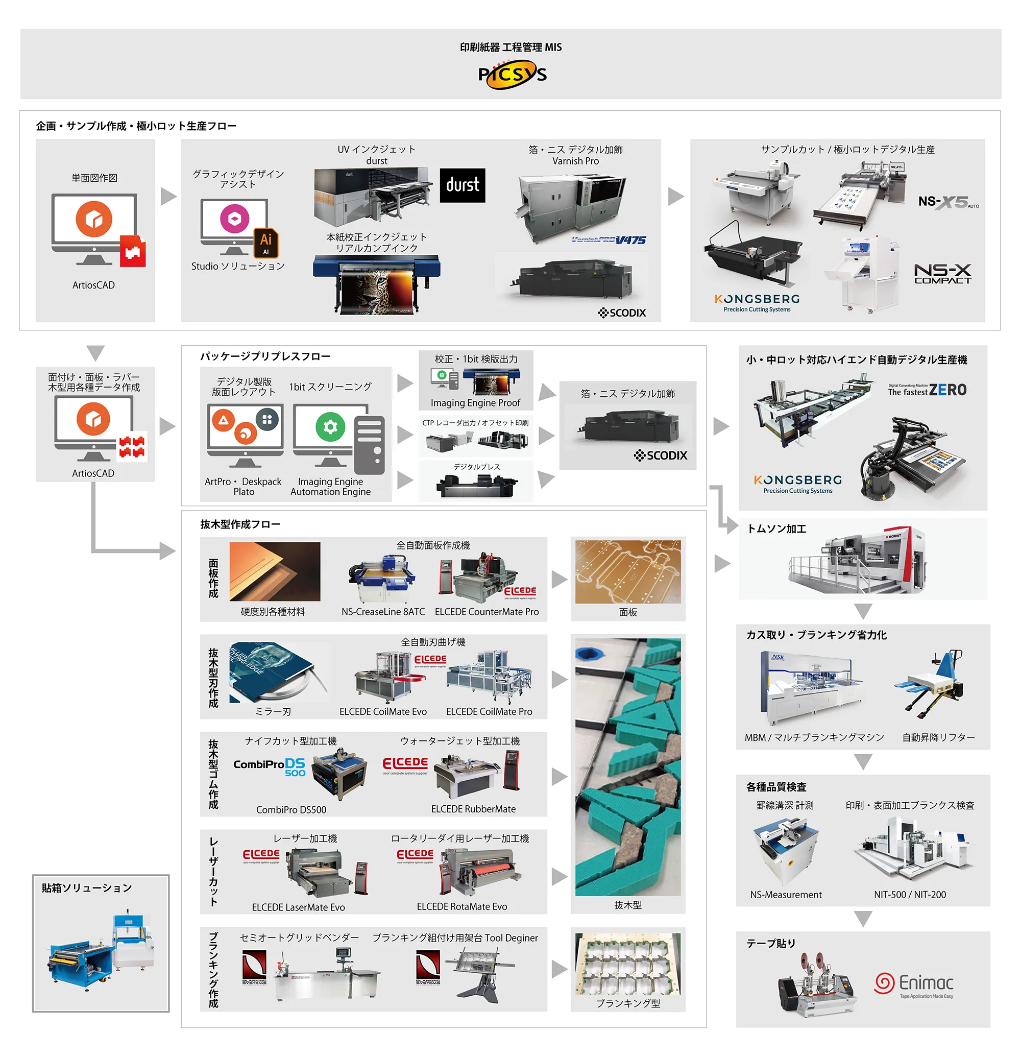NSKでは印刷紙器業界の業務情報の統合システムから各種製造工程の効率化・自動化・省力化をCAD/CAMのテクノロジーを使って進めています。 各工程のソリューションを連携させることで、高付加価値のパッケージを効率良く製造・情報管理できるようになります。