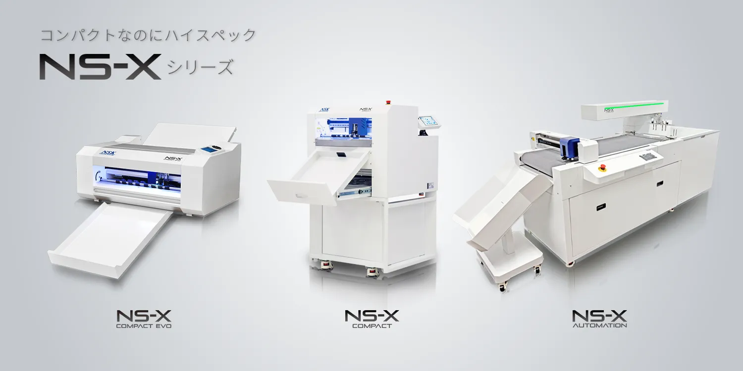 NS-Xシリーズはオフィスに設置できるコンパクトさでありながら、多機能で低コストという現在のマシントレンドに要求される機能を網羅した、コストパフォーマンスに優れたカッティングマシンです。 カメラによる位置合わせ機能を搭載しているため、給紙トレイに資材をまとめて搭載して実行ボタンを押すだけで連続生産を行えます。
