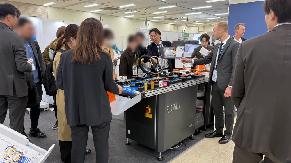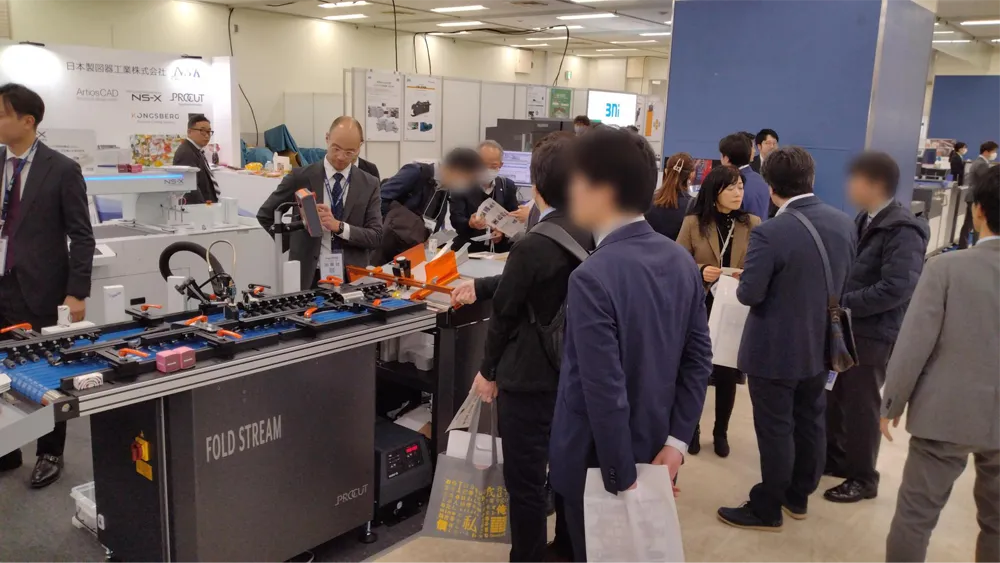 NSKブースでは、マルチベルトコンセプトを採用し、高いカスタマイズ性と短時間で工具無しで段取り替えが可能なオンデマンド生産に最適な次世代型の省スペース型サックマシン 「Fold Stream」 の実機を本邦初公開。高品質な罫線加工を実現したコンパクトカッティングマシン 「NS-X Compact PRO」 との連携でオフィスにおけるサイズで高品質なパッケージ・POPの多品種少量生産のラインがワンオペレーターで構築できるコンセプトを紹介しました。 自動で資材をカットしてパッケージに組み立てるまでのデモンストレーションで、多くのお客様の関心を引きました。