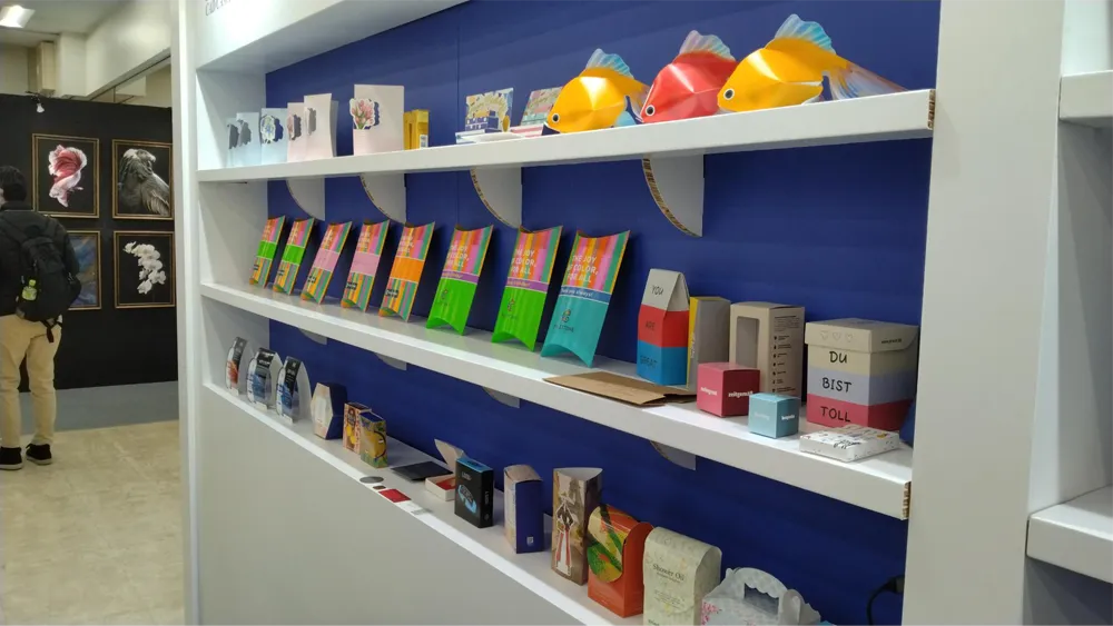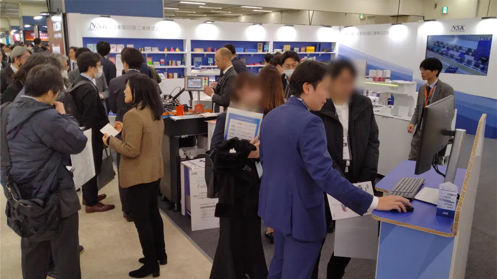 オンデマンドのパッケージファクトリーのイメージコンセプトを打ち出すために、ブース壁のサンプル台に多種多様なパッケージサンプルを展示して、高付加価値のビジネスを後押しするNSKのブランディングイメージを発信する展示会となりました。