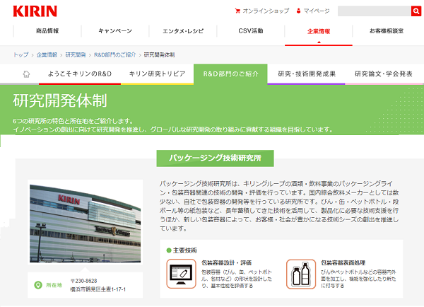 キリングループの酒類・飲料事業のパッケージングライン・包装容器関連の技術の開発・評価を行っています。国内綜合飲料メーカーとしては数少ない、自社で包装容器の開発等を行っている研究所です。
