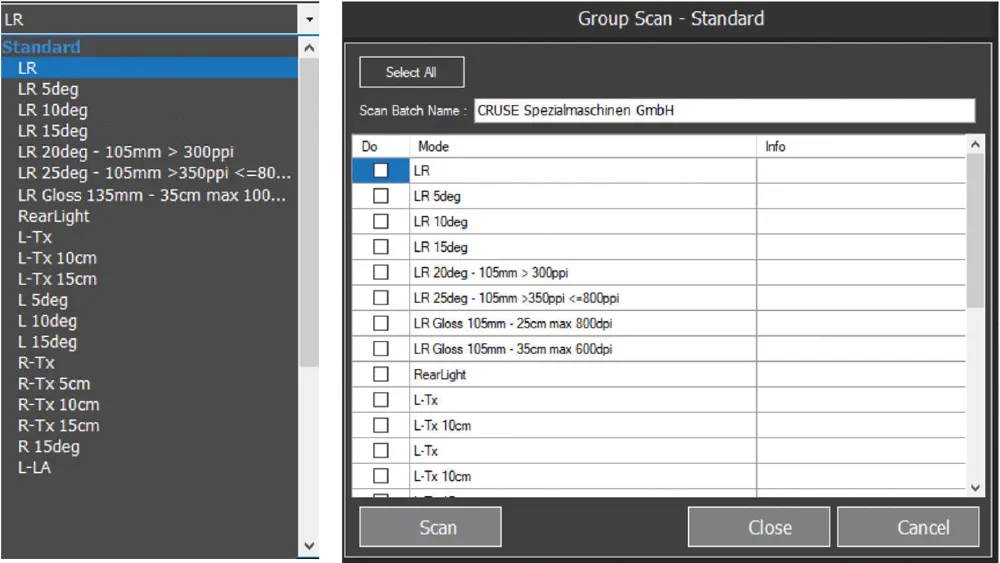 「グループスキャン」機能を使えば、異なるライティングモードでの複数回のスキャンを自動で実行できます。 ライティング角度を変更するためのデバイスの交換など、手動での作業が必要な場合にはソフトウェアが適切なタイミングで通知を行います。