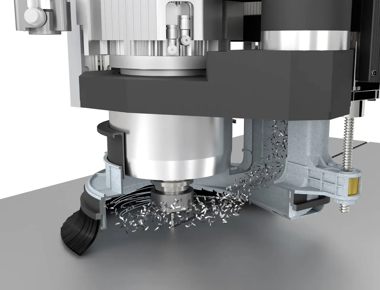 The spindle dust hood features controlled positioning, depending on the length of the slot tool. In addition, the hood has a preferential position for extracting shavings from aggregate, with rotary tool, in any cutting direction (C-axis).