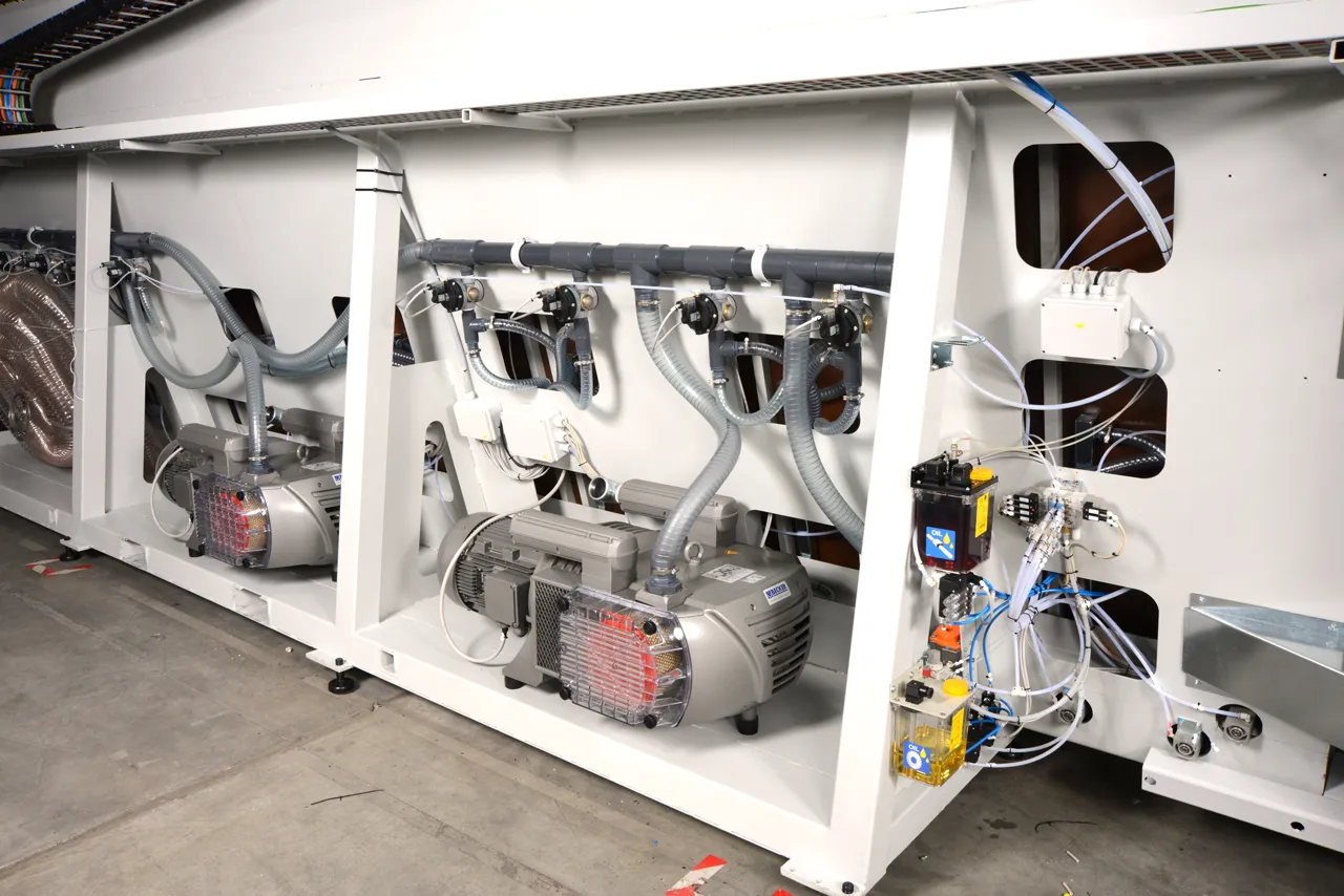 Powerful vacuum pumps (Made in Germany), large size pipes, highly engineered air flows, and automatic control of solenoid valves from PLC make possible multiple combinations of vacuum zones, depending on panel size and thus ensure a more secure hold of the work piece.