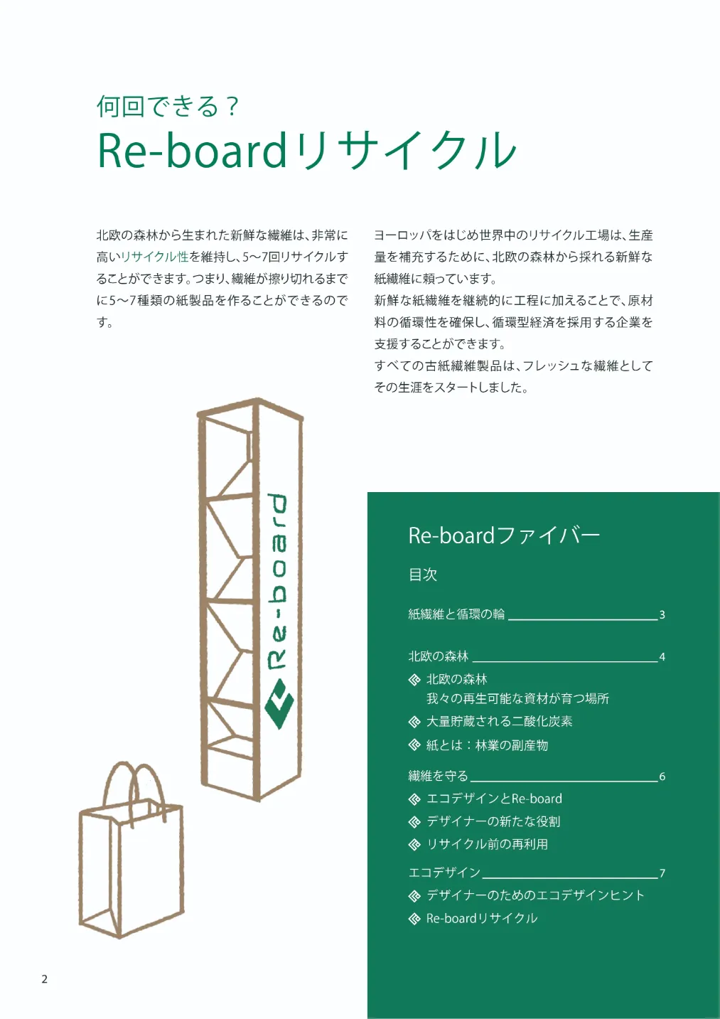 北欧の森林生まれの新鮮な木の繊維で作られるRe-boardは、5~7回の高いリサイクル性を持っています。